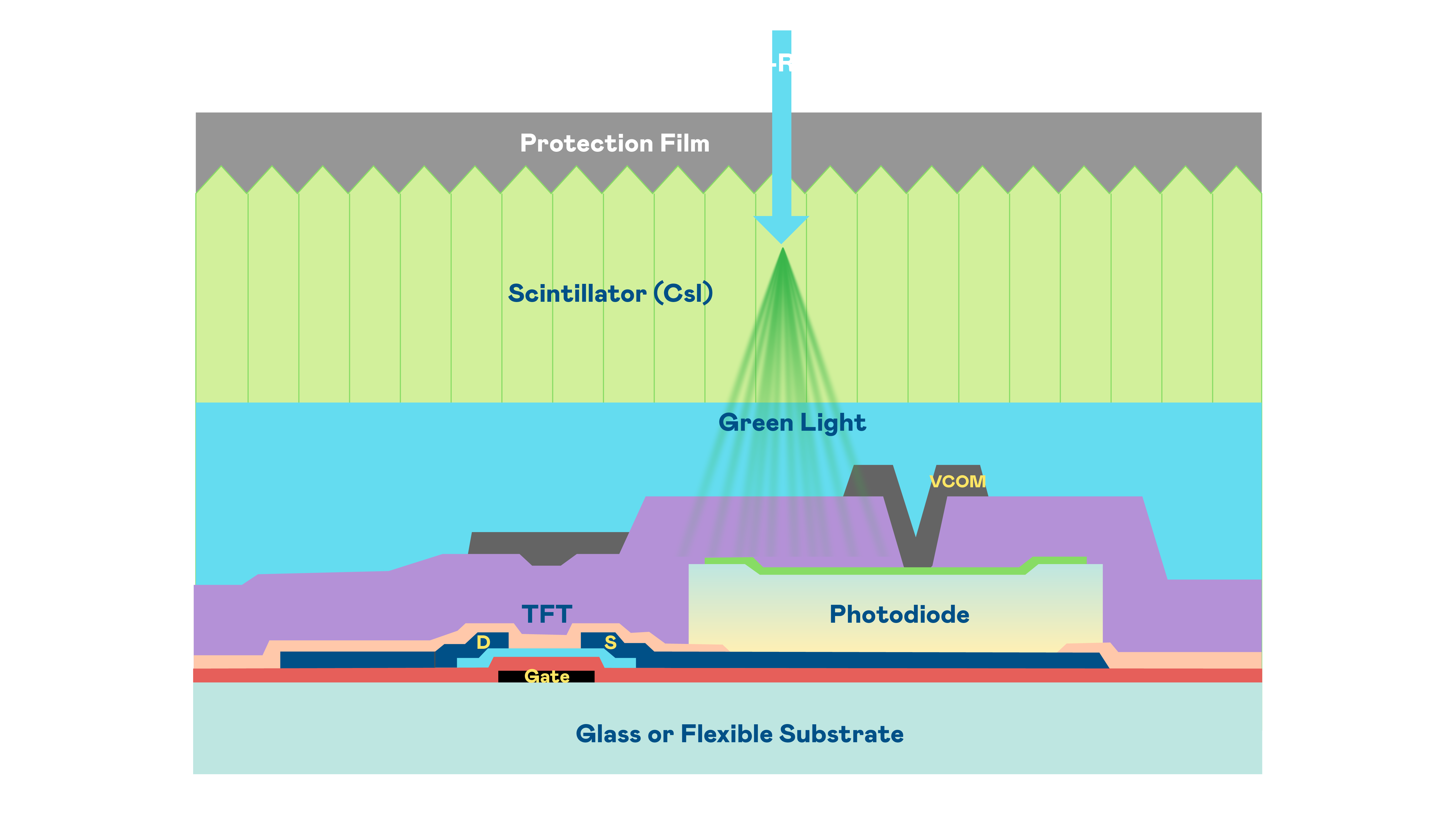 AG官网的X光影像感测阵列使用薄膜电晶体 (TFT) 作为每个像素的读取开关,搭配光电二极体(Photodiode)的光电转换元件,用以感测X光影像讯号。